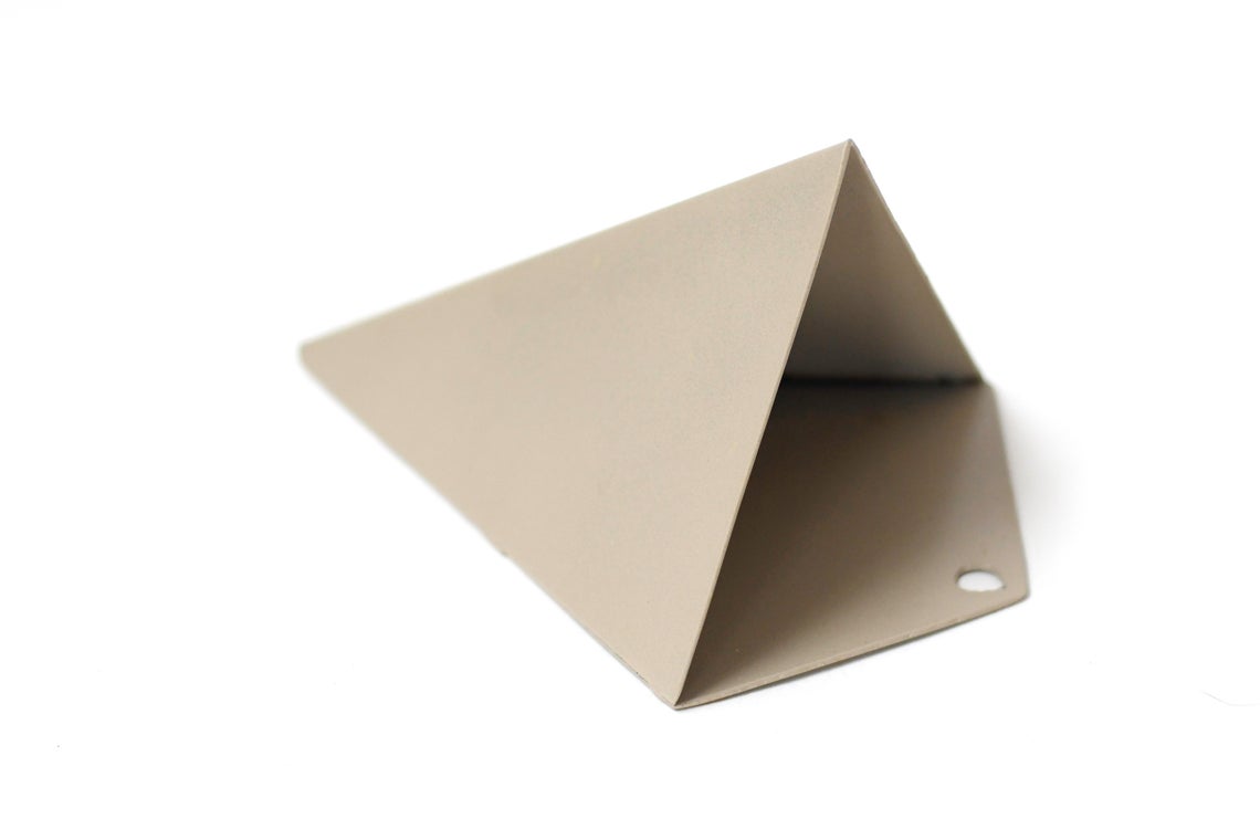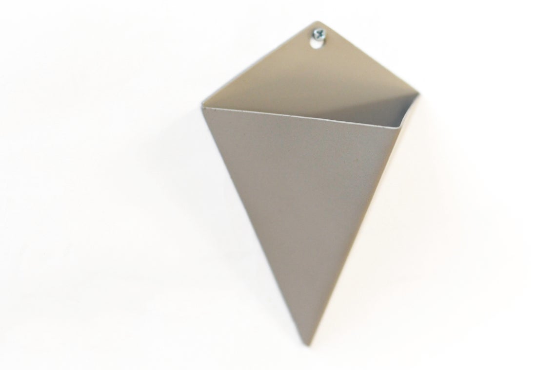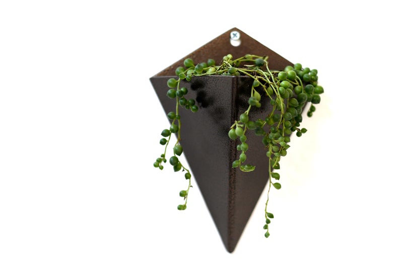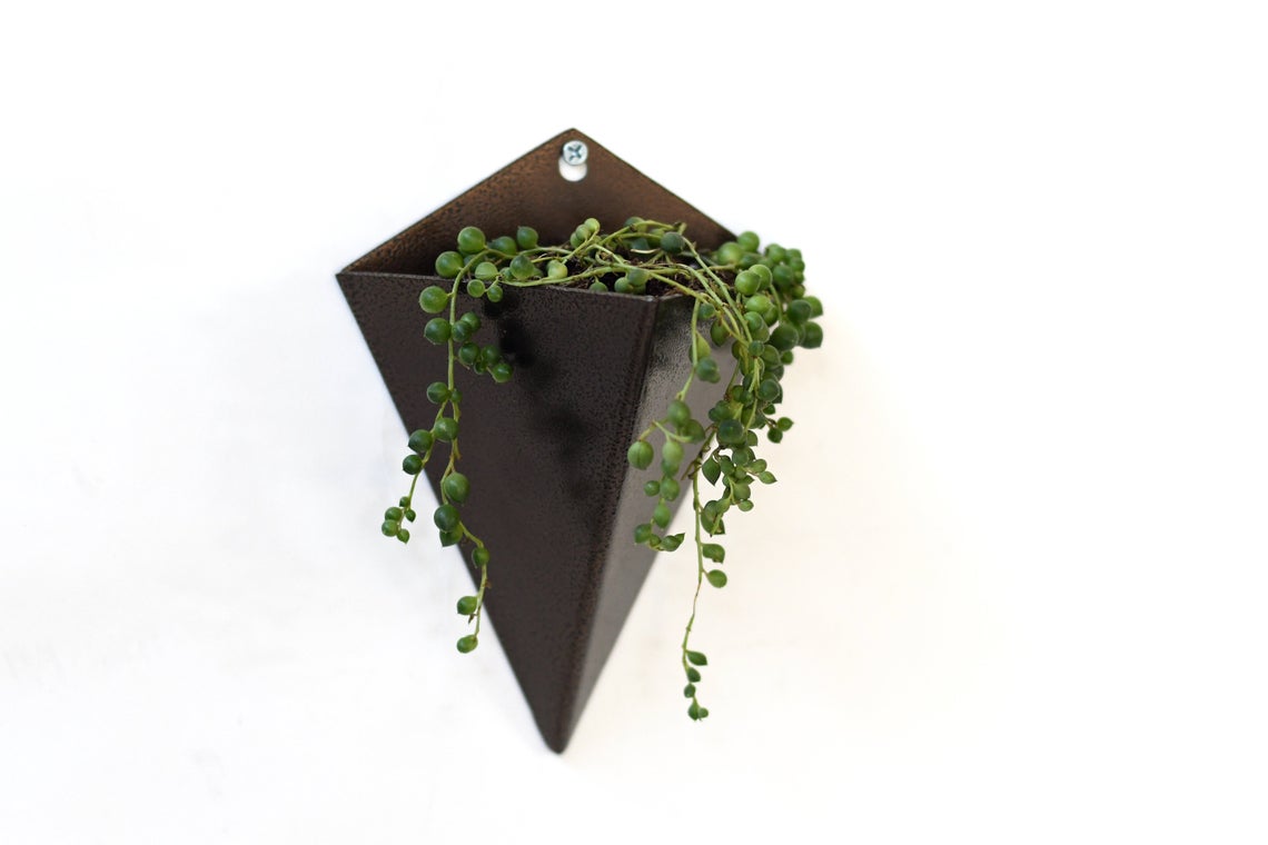 Transform your walls with this elegant Isosceles Planter, a handcrafted geometric design forged from mild steel. Each piece is individually formed, welded, and powder-coated in your choice of finishes for personalized style. Measuring 8" H x 5.5" W x 3.5" D, it's perfectly scaled for compact spaces and smaller plant collections. The oversized mounting hole with single-screw installation enables easy repositioning for watering and seasonal care. Ideal for succulents, cacti, cascading vines, and small ferns. This artisan-made original design brings sculptural interest to any room while remaining practical and functional. Specify your preferred color at checkout. Made to order; allow approximately one week for production. Plants not included.