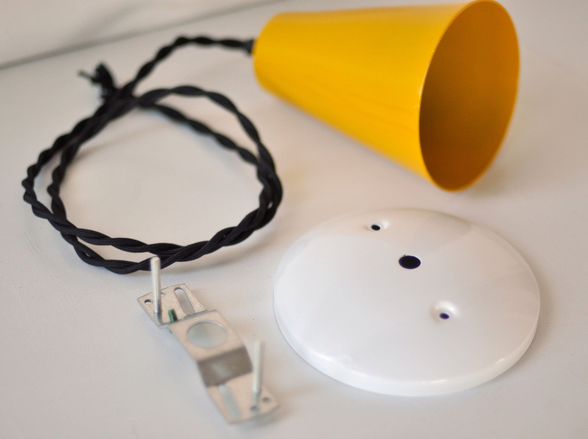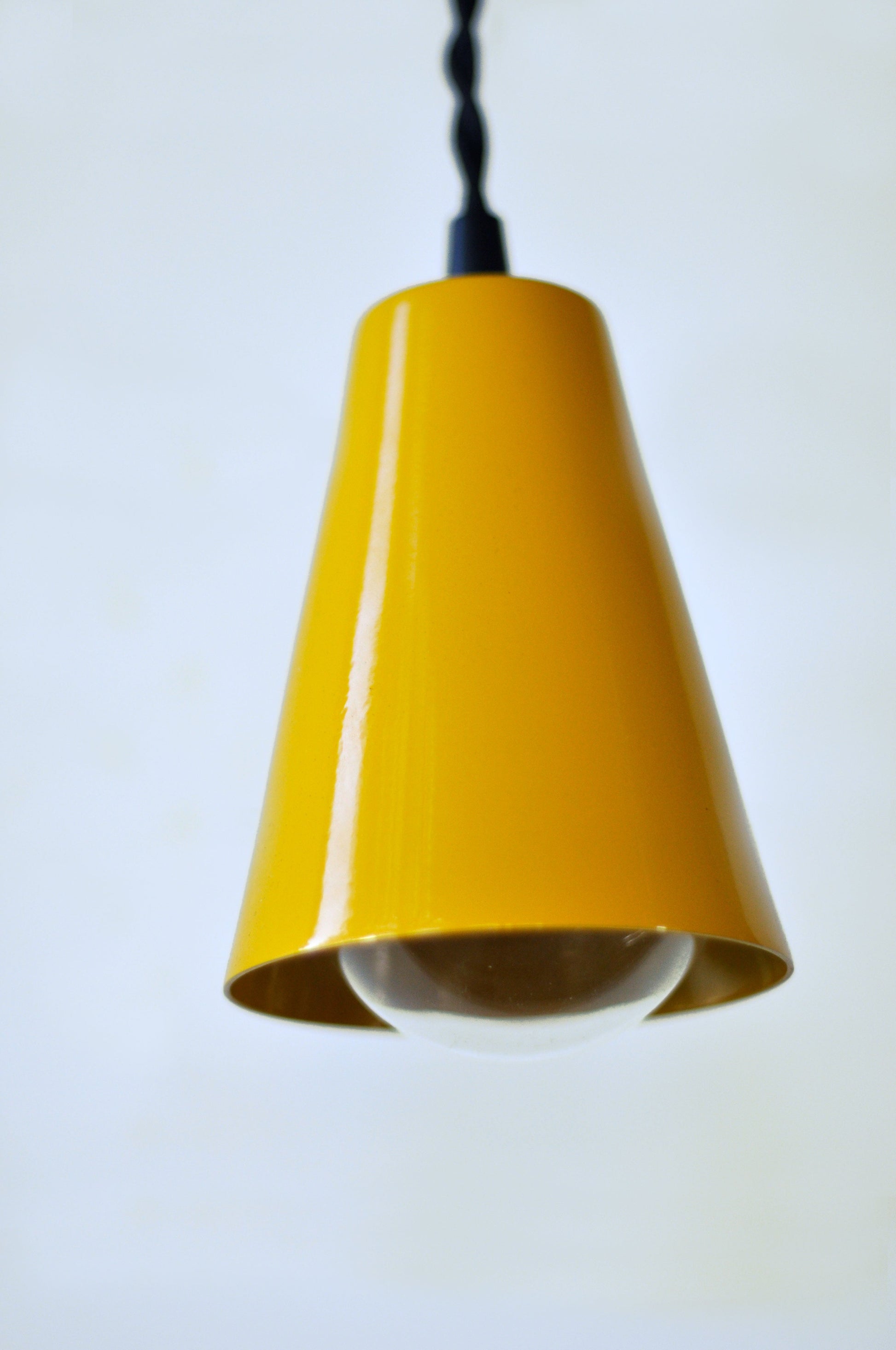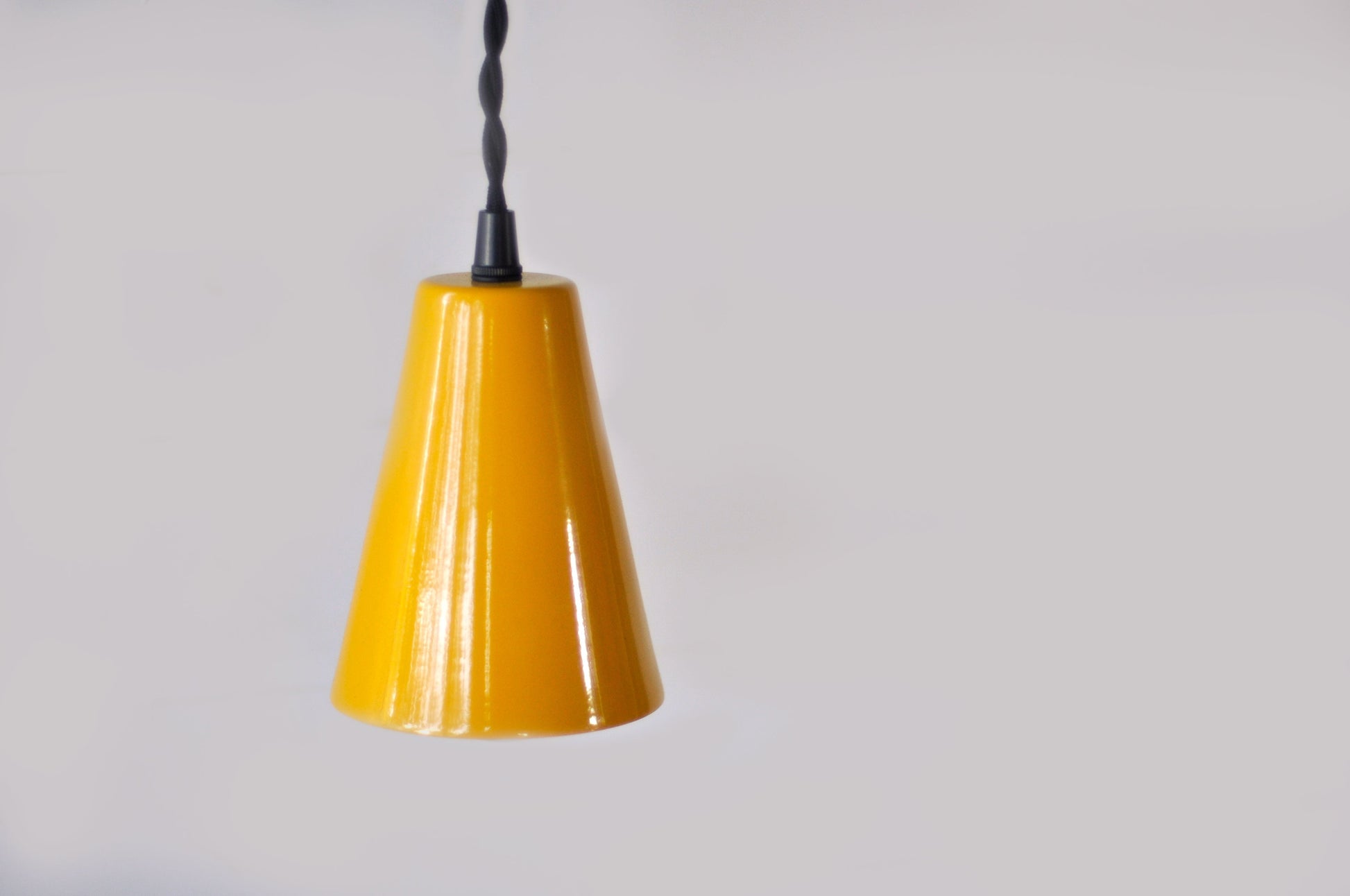 Warm your space with this inviting pendant light featuring a seamlessly spun metal cone in rich Honey Yellow. Fabricated from 18-gauge steel, the 5" H x 4" diameter cone descends from 5' of vintage-inspired black twisted wire, creating an eye-catching focal point. This complete kit includes a UL-listed Leviton E-26 porcelain socket (660W max, 250V max, E3810), white powder-coated canopy, mounting cross bar for standard electrical boxes, and all installation hardware. The warm golden tone complements both modern and eclectic interiors while the hardwired design provides reliable, professional-grade performance. Made to order; allow 3-4 weeks for production.